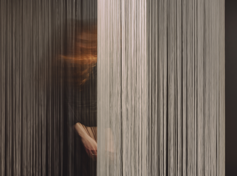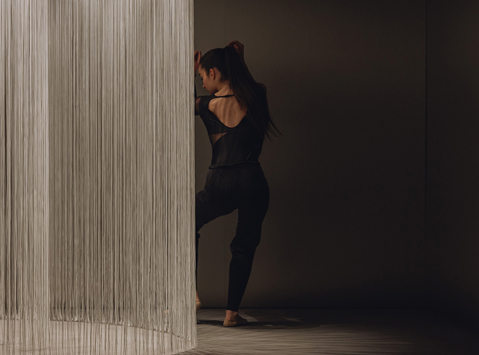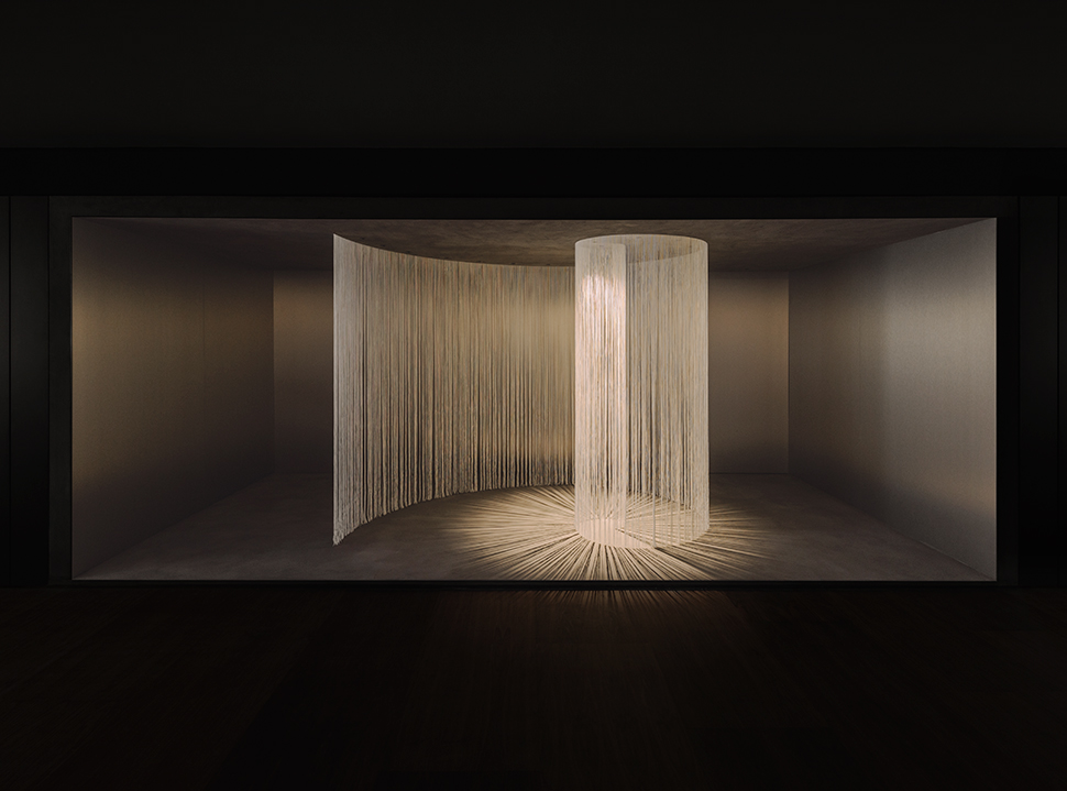 La instalación se materializa a través de hilos suspendidos que trazan en el aire la curva de la espiral. Este gesto sutil genera una coreografía casi imperceptible, conectando el rigor matemático con una dimensión poética. A medida que la mirada avanza, un fondo panelado de aluminio disuelve los límites del espacio, multiplicando los reflejos y proyectando la instalación hacia un infinito visual donde forma y luz parecen no tener fin.